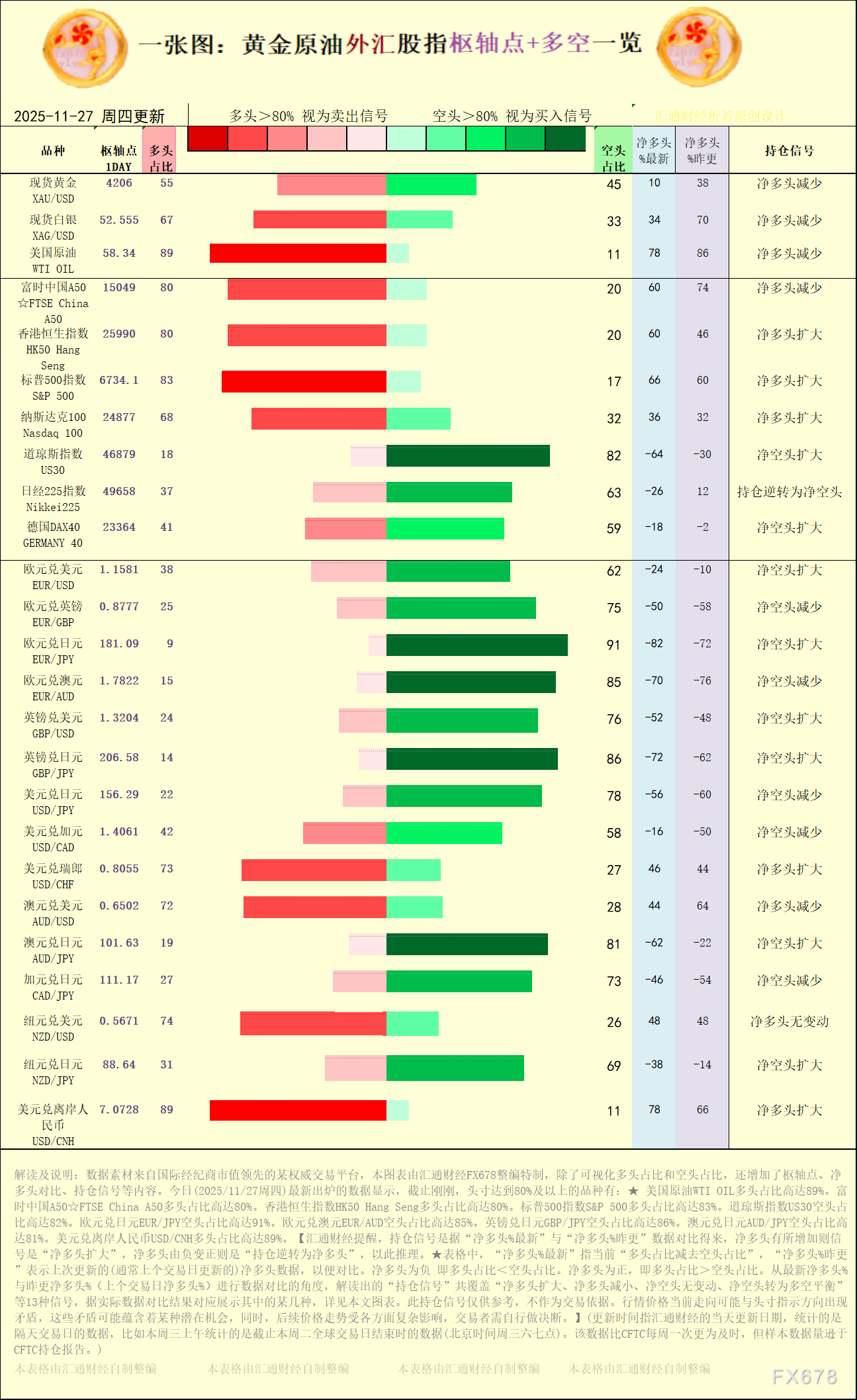 ex中国区代理一张图:2025/11/27黄金原油外汇股指“枢纽点+多空持仓信号”一览